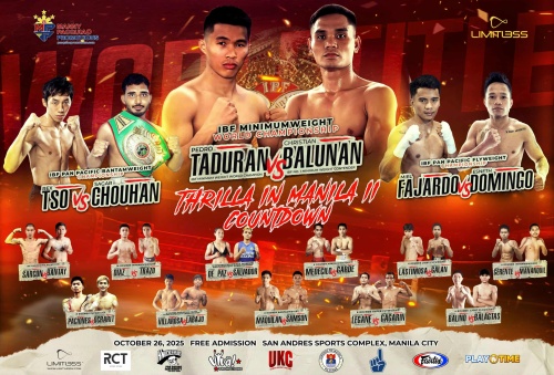 MANNY PACQUIAO PROMOTIONS PRESENTS “COUNTDOWN TO THRILLA IN MANILA” AND “THRILLA IN MANILA 50” PhilBoxing.com Fri, 17 Oct 2025 ![]() Two Historic Fight Cards Set for October 26 and October 29 in Manila to Celebrate the 50th Anniversary of Muhammad Ali vs. Joe Frazier MANILA, Philippines — In celebration of one of boxing’s most iconic fights of all time, Manny Pacquiao Promotions (MPP) proudly announces a monumental double-header: Countdown to Thrilla in Manila on Sunday, Oct. 26, at San Andres Coliseum, followed by the landmark Thrilla in Manila 50 event on Wednesday, Oct. 29, at Smart Araneta Coliseum. A historical extravaganza across two action-packed nights of boxing, legendary boxer-turned-promoter Manny Pacquiao, with the help of MPP President Sean Gibbons, Chief Financial Officer and Vice President Tony Cohen, and Lead Matchmaker Brendan Gibbons have architected a monumental spectacle for the passionate Filipino fans. Countdown to Thrilla in Manila and Thrilla in Manila 50 serve as the last two tentpole events before MPP’s highly anticipated U.S. debut on Saturday, November 29 at Pechanga Resort Casino in Temecula, Calif. Both shows will honor the 50th anniversary of Muhammad Ali and Joe Frazier’s epic 1975 heavyweight showdown, one of the most legendary bouts in sports history, while showcasing the Philippines’ finest fighters and rising international talent.