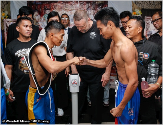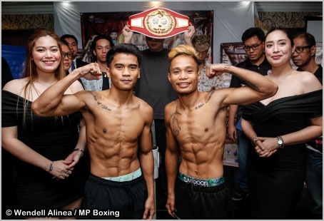 Miel Fajardo (L) and Esneth Domingo pose during Saturday's weighin. In the co-main event that is the highly anticipated bout by local fans between Esneth Domingo (22-3, 14 KOs) and Miel Fajardo (12-3-2, 11 KOs) for the vacant International Boxing Federation (IBF) Pan Pacific flyweight strap.