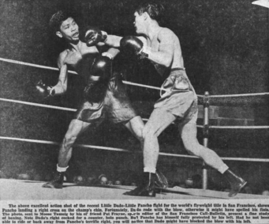 Photo: Little Dado–Little Pancho world flyweight title fight. Pancho lands a right cross. (Honolulu Star-Advertiser, Jul 1, 1940) The last championship bout here was the Little Dado–Little Pancho draw at the San Francisco Civic Auditorium (now the Bill Graham Civic) on June 17, 1940.