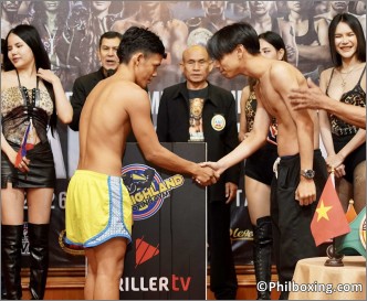 Mark Jason 'KingBabyBoy' Almacen of the Philippines shakes hand with his taller opponent Natthaphat Thangsalai of Thailand during Friday's weighin in Bangkok.