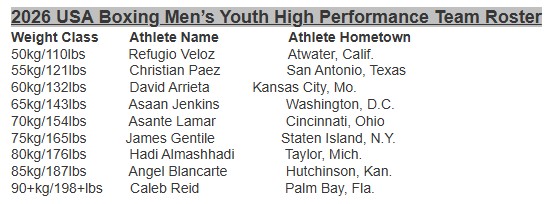 2026 USA Boxing Men's Youth High Performance Team Announced PhilBoxing.com Thu, 05 Mar 2026 Nine Boxers Named to USA Boxing Youth High Performance Team to Compete at World Boxing Futures Cup COLORADO SPRINGS, Colo. (March 3, 2026) – The 2026 USA Boxing Men’s Youth High Performance Team was announced on Monday, finalizing the roster for the upcoming 2026 World Boxing Futures Cup in Bangkok, Thailand, and the remainder of the year. Of the nine athletes invited to the 2026 USA Boxing Youth High Performance Selection Camp, all nine were named to this year’s team. The roster announcement concludes a successful Selection Camp for the USA Boxing High Performance department at the United States Olympic & Paralympic Training Center (USOPTC) in Colorado Springs, Colo. The USA Boxing Youth High Performance Team selected all nine boxers invited to its Selection Camp, setting the stage for a major year of competition for the selected athletes. The men’s roster spans nine weight classes, with eight of the nine boxers joining the team for the first time. “The men’s team displays the competitiveness necessary to compete at the international level,” USA Boxing National Development Coach Edward Fonteneaux stated. “I am also excited for this team to represent the United States and display their talents and show that they belong at the top of the podium.” Angel Blancarte (Hutchinson, Kan.) was named the men’s team captain after making the team for the second consecutive year. Blancarte will lead the team through his veteran experience and push his teammates to achieve the standard of excellence set in previous years. “After breaking out of his shell and displaying his discipline, character and leadership, it showcased to me what the team needed for this year,” Fonteneaux noted of Blancarte’s leadership characteristics. “He has already shown the characteristics of an individual who will hold this team accountable and push them to success.” A complete list of the nine athletes named to the 2026 USA Boxing Youth High Performance Team is listed at the bottom of this announcement. The 2026 USA Boxing Youth High Performance will first compete at the 2026 World Boxing Futures Cup in Bangkok, Thailand, March 8-15. The team will travel to Thailand on Wednesday, March 4, departing from the USOPTC in Colorado Springs, Colo. The USA Boxing Youth High Performance Team is led by National Development Coach Edward Fonteneaux (Fayetteville, N.C.). Fonteneaux will be assisted throughout the year by High Performance Pool coaches, including Holly Gregson (Idaho Falls, Idaho), Jason Hamilton (Spanaway, Wash.), Yessenia Montalvo (Bloomfield, N.J.) and Ronald Wright (Columbus, Ga.). Follow the 2026 USA Boxing Youth High Performance Team on all social media platforms throughout the year for an inside look at Team USA representatives. ![]() |