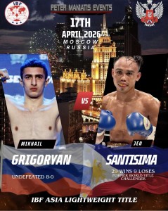 Former world title challenger Jeo Santisima is set to return to the international stage this Friday, April 17, when he faces rising Russian prospect Mikhail Grigoryan for the vacant IBF Asia Lightweight Title.