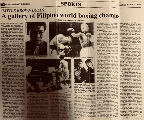 Hermie Rivera: A Fil-Am Original By Emmanuel Rivera, RRT PhilBoxing.com Fri, 17 Apr 2026 ![]() Hermenegildo Ordoña Rivera was born on April 17, 1938, in Baguio City, Philippines. Growing up in the cool climes of the Mountain Province, amidst the clouds, he witnessed the fusion of Filipino and American cultures characteristic of "The City of Pines". As a young waiter, he polished his command of the English language and refined his manners through osmosis and lively interactions with American soldiers at Camp John Hay and international educators at Teacher’s Camp. ![]() Baguio was a bustling hub infused with American influence— a crucible of culture and tradition— and the environment appealed to Rivera, whose autodidactic nature complemented an unquenchable thirst for knowledge. He embraced life with gusto and explored the world through books, travel, and keen observation. Rivera’s journey took him to far-flung corners of the Philippines, like Laoag, Cebu, Davao, Jolo and Aparri. ![]() In 1965, as an aspiring disc jockey, he landed in the coastal City of Dagupan where he met the love of his life, our mother Cristina Pasaoa. Their union blessed them with six children, Antonio, Charina, Maria Christine, Gerardo, and Hermenegildo Jr., and I, grandkids Keana , Leila, Nikolus, Grant, Louis and great grandchildren Evangeline and Eleanor. ![]() In 1983, Rivera and our family migrated to the San Francisco Bay Area, embarking on a new chapter in their lives. Rivera's heart remained tethered to his roots, as evidenced by his continued involvement in promoting Filipino culture and heritage, both in the Philippines and abroad. ![]() It was in the world of boxing that he left an indelible mark. Known for his sharp wit and deep understanding of the sport, Rivera earned recognition as a boxing manager, guiding fighters like Luisito “Lindol” Espinosa, one of only seven boxers since 1890 who wore the world’s bantamweight and featherweight crowns, and Morris East, the youngest Filipino world champion. ![]() The Sweet Science had a particular allure to my father. The sport became his metaphor and guiding mantra. He shared his insights as a fight analyst and his colorful commentary endeared him to fellow fans of the gloved game. ![]() His passion for storytelling led him to a career in broadcasting and lent his voice to various radio and television stations like RPM, DZRL, DZTD, Channel 4 and 5, Philippine Broadcasting Services, MBC 11, IBC 13, National Media Production Center, Maharlika Broadcasting System, and PhilBoxing.com. ![]() "Little Brown Dolls: A Gallery of Philippine Boxing Champions" (Philippine Daily Inquirer, March 20, 1994). ![]() "The Best Of A Nation: The All-Time Top 10 Of The Philippines" (The Bible of Boxing, The Ring), August 1994) ![]() My father, the late Hermie Rivera, cherished every moment he shared with you—his friends, his peers, and even the rare foe. He is the guiding inspiration for our celebration today, his natal day…and the humble launch of the PhilippineBoxingHallOfFame.org aimed at honoring the stories of The Greatest Boxers Made in the Philippines…Though he would have loved to be here, I am sure he would have insisted that this special occasion not revolve around him. ![]() On January 15, 2016, my father passed away in his sleep at the age of 77, leaving behind a legacy of gratitude, respect and the following message he often repeated during his time with all of us. “Keep punchin’,” he used to say, “and rise from the canvas like Greatest Boxers Made in the Philippines!” Click here to view a list of other articles written by Emmanuel Rivera, RRT. |